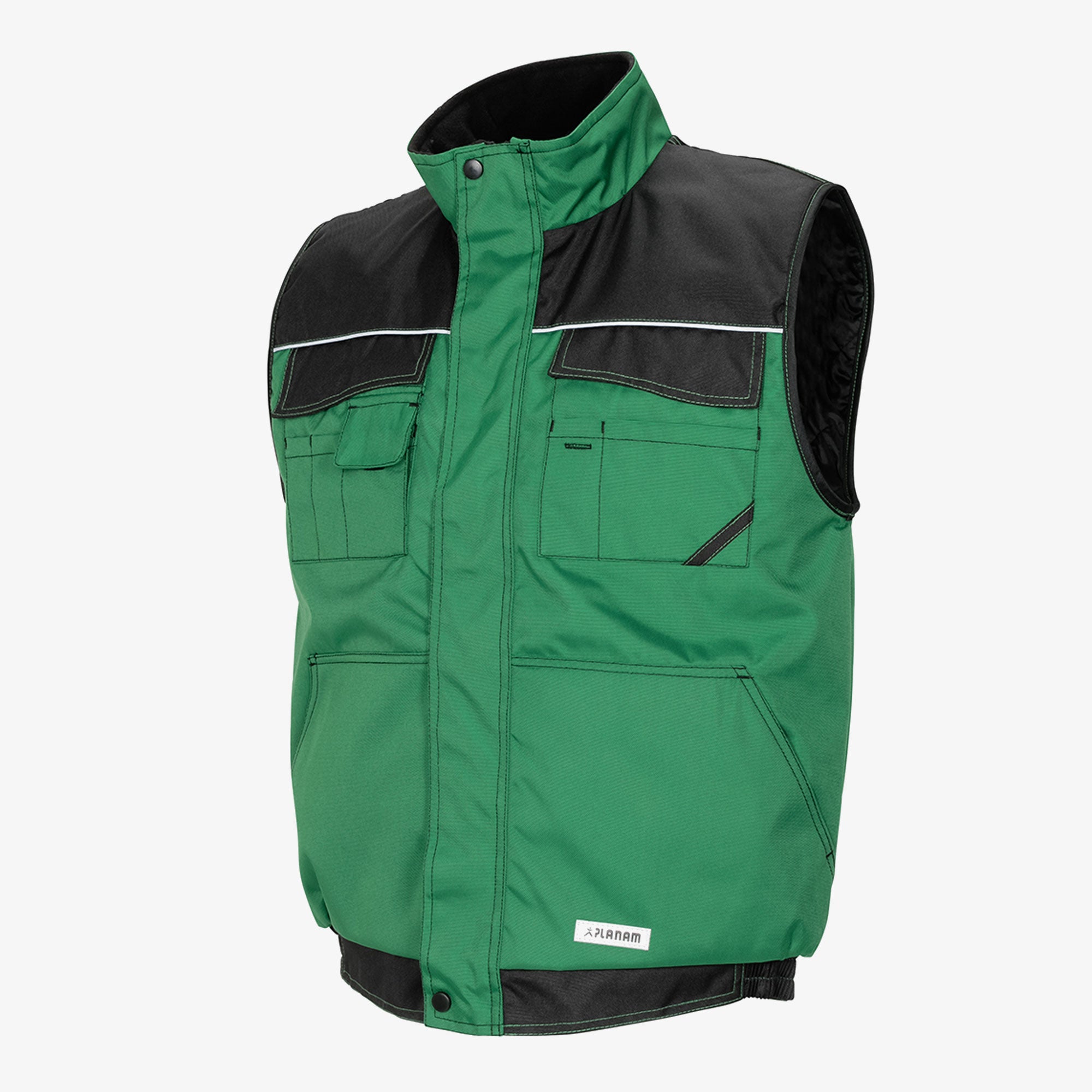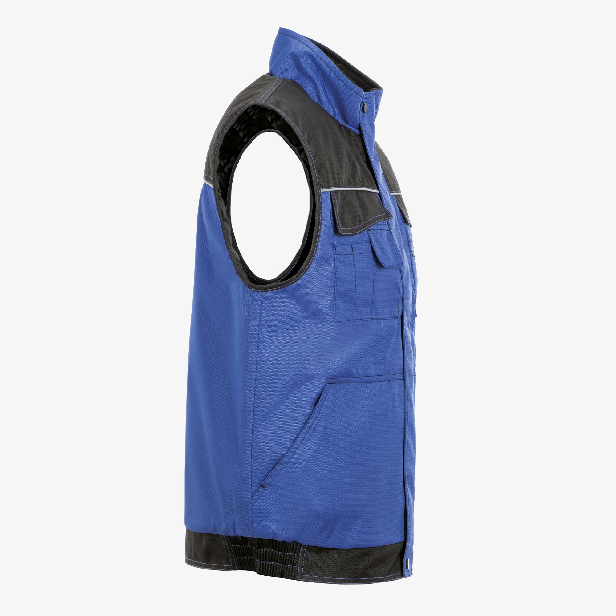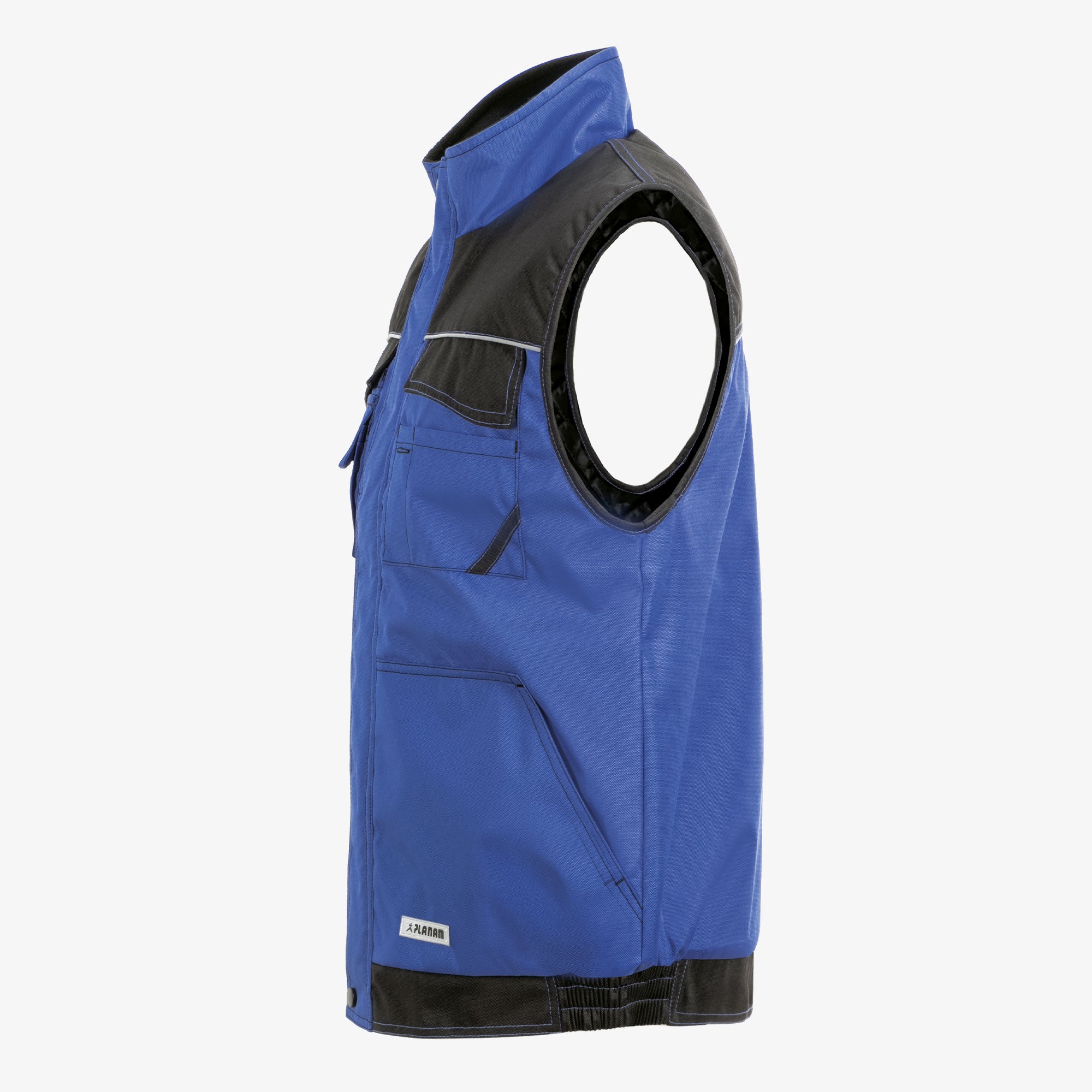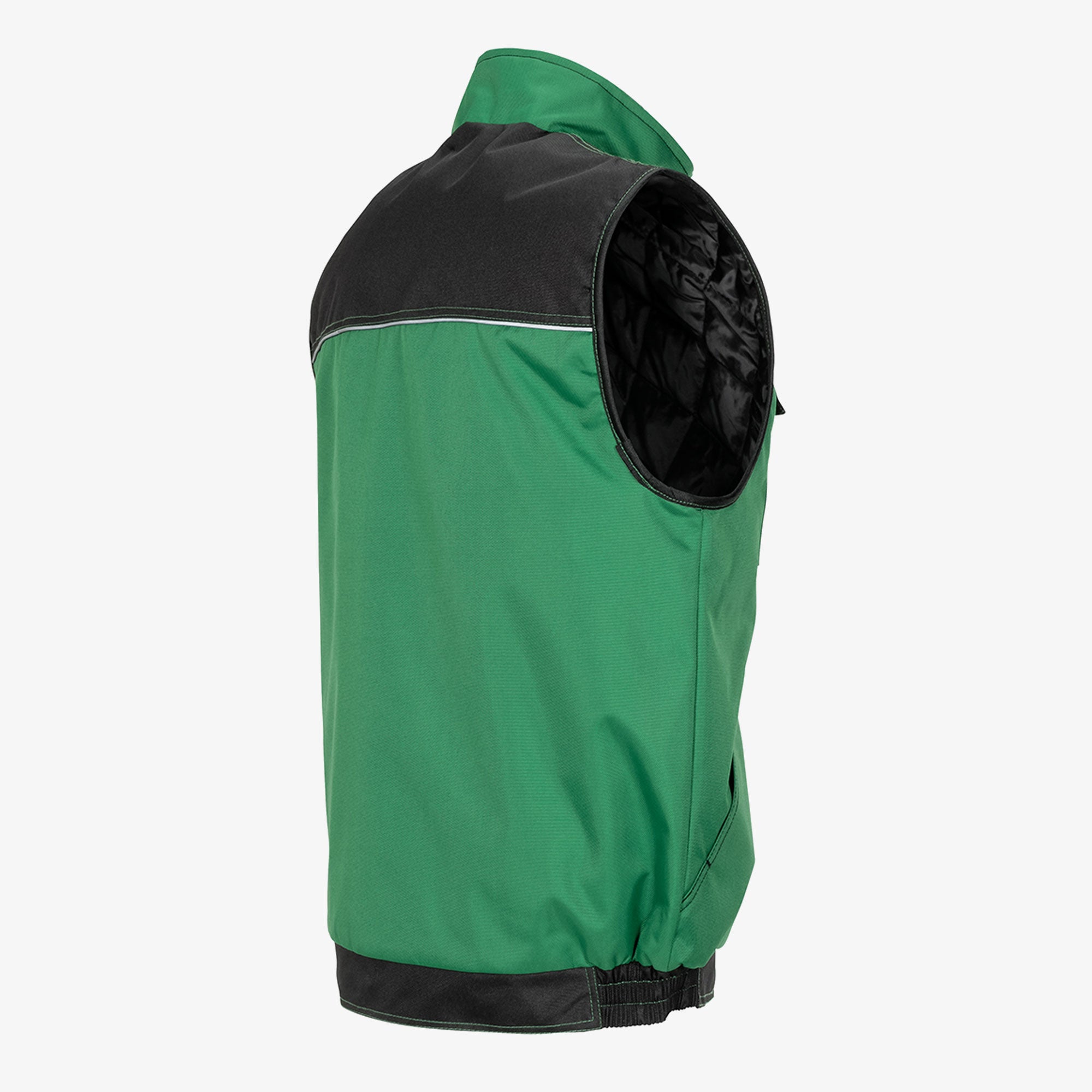 A robust weather vest for any working environment, waterproof outer material with PU coating, two-tone, reflective parts on the chest, arms and back ensure good visibility of the user, 2 chest pockets with practical sub-types, mobile phone pocket, 2 side pockets with diagonal access, hidden front cif, quilted Taft lining.